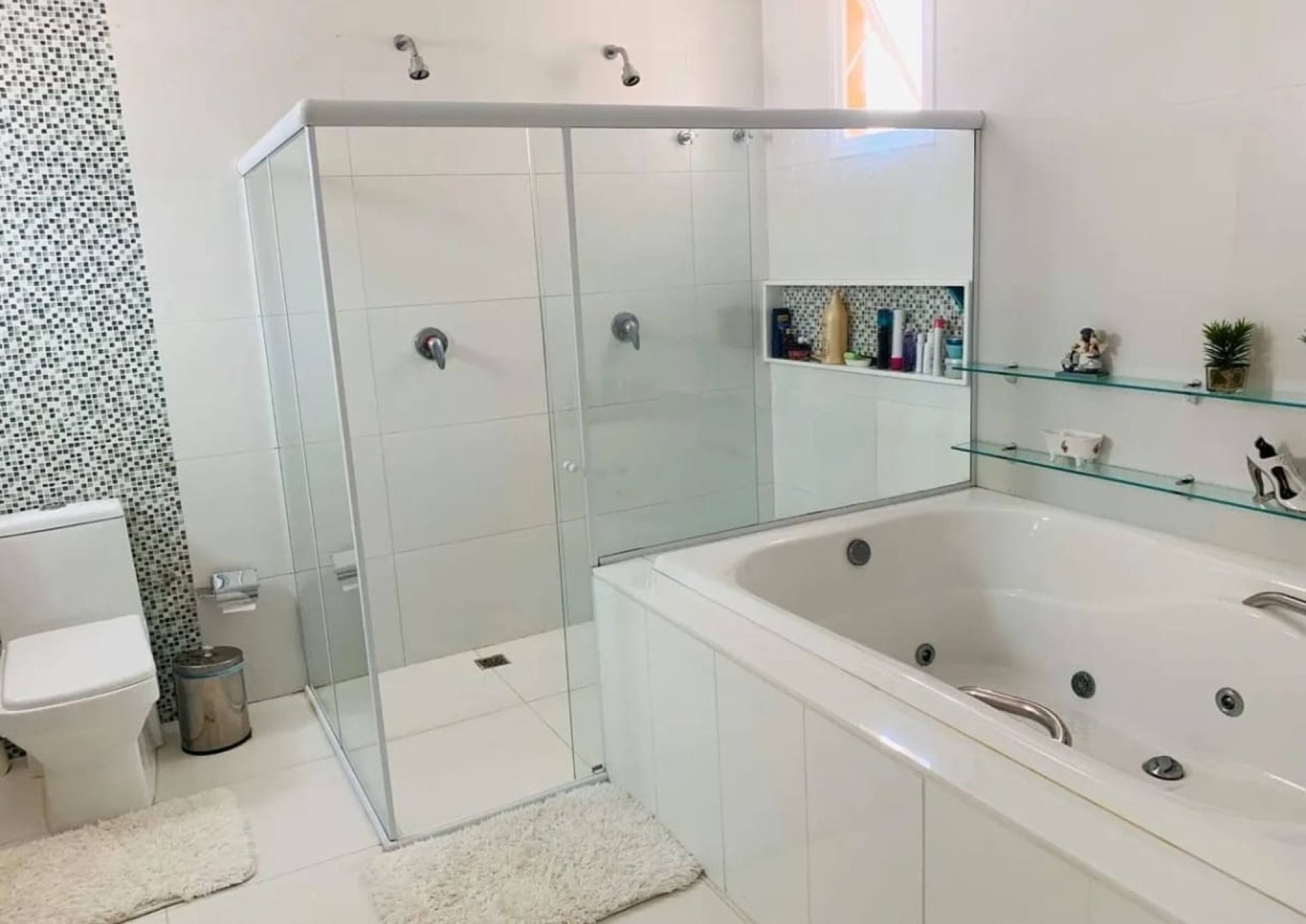 São 4 suítes espaçosas, incluindo uma suíte máster de 70m², com closet e banheiro equipado com hidromassagem. A casa conta ainda com 7 banheiros ao todo, escritório privativo, três salas amplas e uma cozinha integrada à copa, ideal para quem valoriza momentos de convivência.
